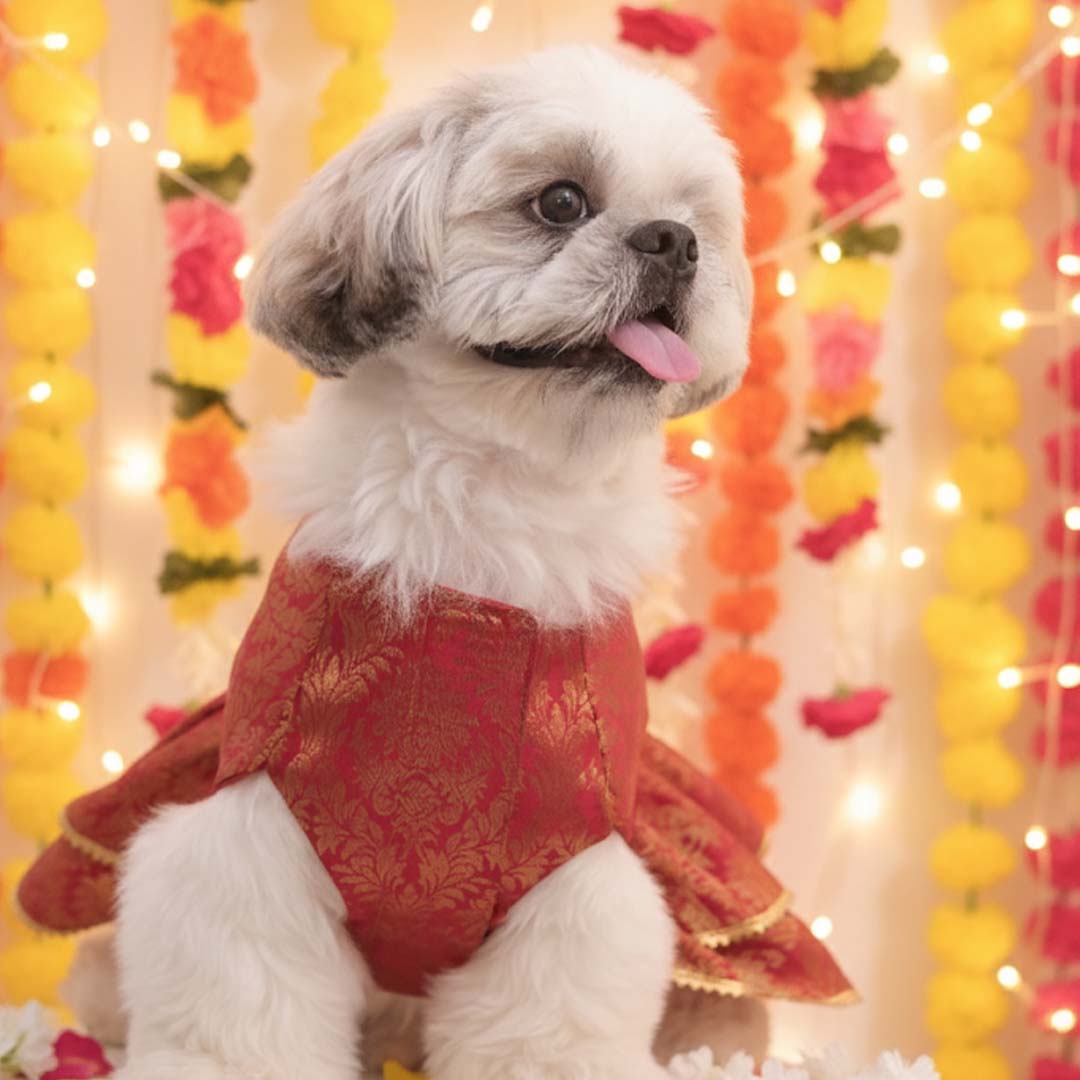 Dress your furry princess in royal elegance with the Maharani Pet Lehenga. Designed in stunning red and gold tones, this festive lehenga brings a regal touch to weddings, parties, and cultural gatherings. Soft, comfortable, and beautifully crafted, it ensures your pet enjoys the celebrations in style and ease.